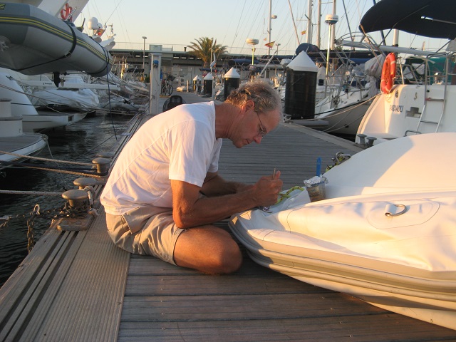 So, instead of heading out, we are doing projects today, and tomorrow. First we dragged the dinghy up onto the dock to scrap off the growth and wash the bottom. Then Bob managed to find the pinhole that had eluded us causing the dinghy to go soft after a few days. After some on-line repair instructions and an aptly applied patch the dinghy was back in service–good as new.