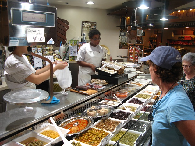 We went walking and found the central market with fresh fish, 25 types of olives from all over Spain, and fabulous fresh fruits and vegetables. We also found the market that has hot baguettes. Good thing we are doing so much walking or I would have Omar the tentmaker making me a new wardrobe by the time we get to Morocco! Crossing the Atlantic was good for weight loss though. We love the markets and are enjoying a very healthy Mediterranean diet. On our way back we discovered a beach with a very active stretch of boardwalk that is less than a half mile from the boat.