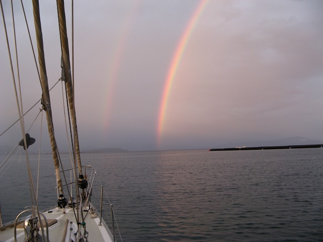 When we left Gaeta, after a week and a half in the marina, and one night on the hook where we witnessed a complete double rainbow followed by a vibrant sunset over the mountains.