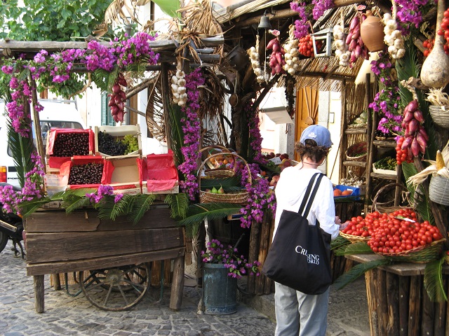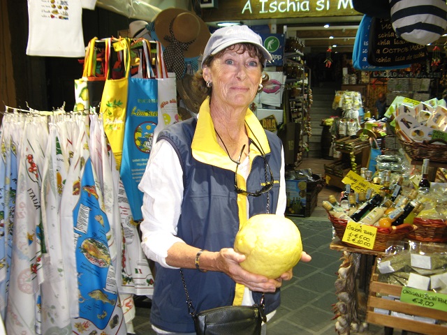 We went ashore to explore the village and found a quaint main street with shops, lemons, gelato cafes, lemons, restaurants, lemons, waterfront “beaches” with chairs and umbrellas on the rocky (no sand) waterfront; oh, and did I mention lemons! Yes, we have arrived at the west end of the land of the lemon. The entire Naples Bay area, islands, and Amalfi Coast are famous for their lemons, and they know how to market them.