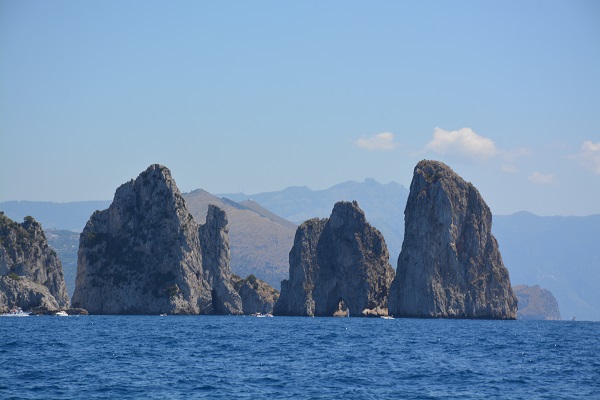 Capri is surrounded by high limestone with craggy cuts into its sides. A number of grottos have formed, large enough for small boats to motor into them for a look around. As we motored along the coast we passed dozens of small tour boats, filled with tourists, heading for the grottos. One of the more popular grottos is called the “Blue Grotto” and is featured on Rick Steves Italy video series. The island only has two access points which made it easy to protect in Roman times and, today, limited areas of protection to anchor in anything but settled weather.