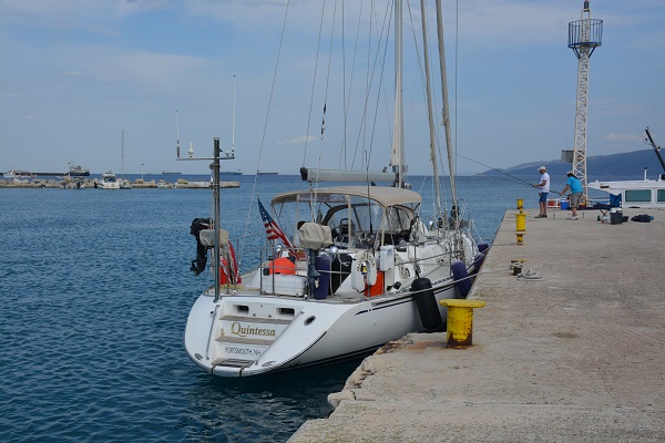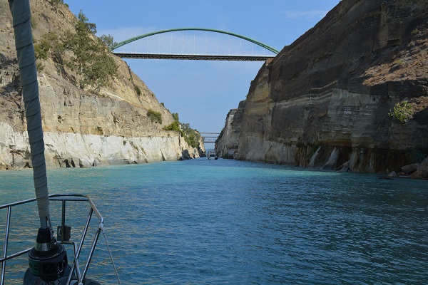 The passage took about thirty minutes – an expensive thrill. The Corinth Canal is one of the most expensive canals in the world, on a per mile basis. Yachts are charged by overall length. Our cost for the trip was 260 euros. Once we exited the eastern end of the Canal we tied up to a long dock and went in to the office to pay.