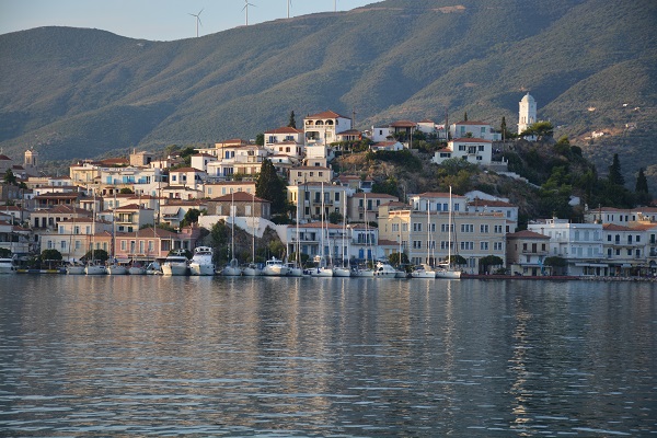 Poros became our next destination. It is just off the Peloponnisos peninsula allowing us several options for touring and also has a good fast ferry service to Athens for Kathy and Brad to return at the end of their stay. There is a convenient anchorage just off the town of Poros, located on a small peninsula at the southwestern part of the island. The Poros waterfront is busy with restaurants and cafes, clothes shops, souvenir stores, motor bikes, ferries and water taxis. Typical of Greece in the summer, it is quieter in the afternoon than the evening, when it is crowded until after midnight with people enjoying the cooler evening air.