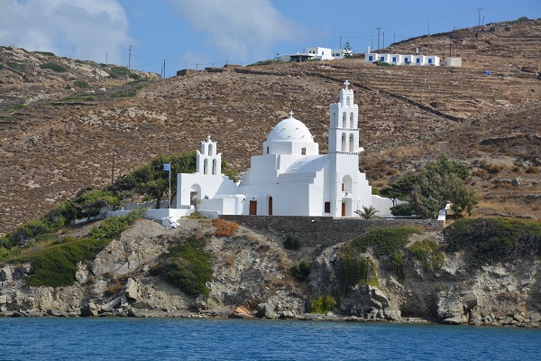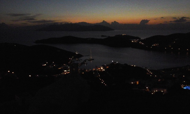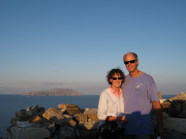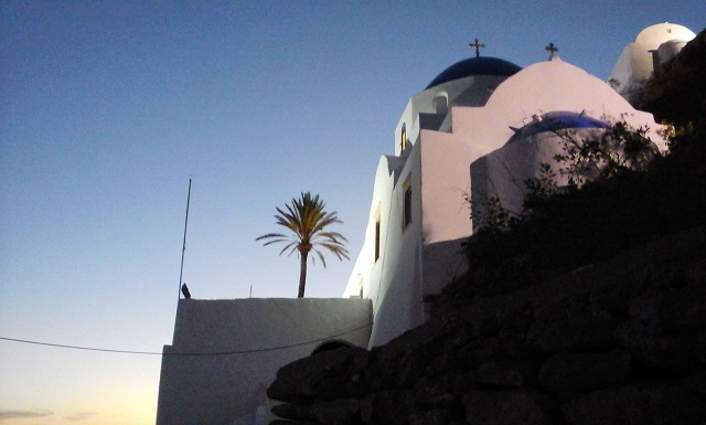 Bob and I finished the exploration of Ios on our own. We set off for the town above the harbor and found it to be a delightful, albeit quieter, village of white painted buildings and narrow alleyways of shops and restaurants. Near the top of the hill the village sits on is the large Greek Church with three small chapels, one beside another, up to the peak of the high hill. For exercise we walked to the top and enjoyed the sunset.