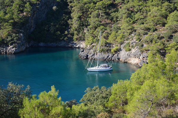 On our way to Kas we found a tiny secluded anchorage (long lines ashore) in one of the hundreds of deep calanques (steep walled deep ravine) in the area. One could probably squeeze 5 of 6 boats into the anchorage—this night we were all alone. The next day we hiked up through one of the canyons which reminded Bob of his Grand Canyon trip only smaller.