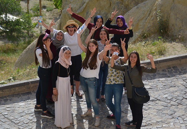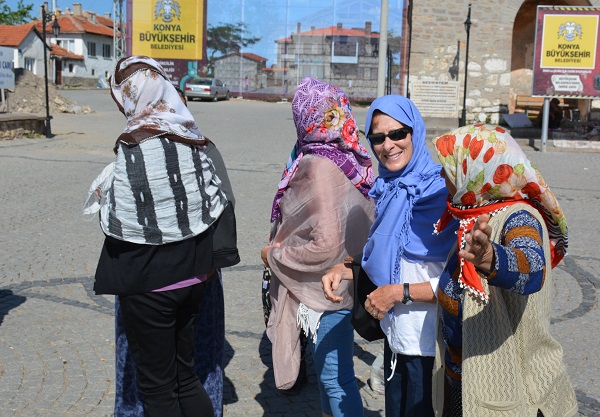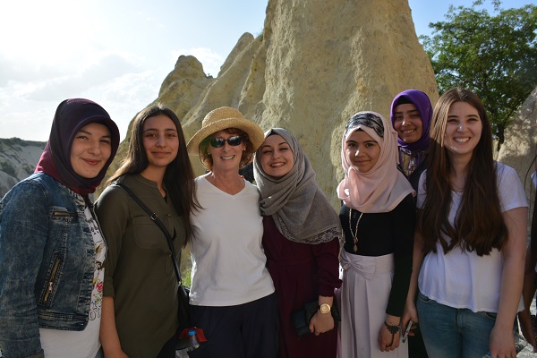 While in the Open Air Museum we noticed a group of high school girls that seemed to be squeezing into each space with us rather than dropping back or going ahead of the traffic flow. After an hour or so, several walked past Sara saying ¨hello¨. When Sara responded to them, they clustered around with great excitement, wanting to know if we were Americans. They had never met an American. Out came the cell phones and everyone wanted a selfie with the American. One of the girls spoke limited English so she was put in the lead. They were full of questions and shared the two phrases they knew – “American dream” and “We love Obama”. We learned they are from a village in northeast Turkey which is quite insolated. They wanted us to come to their village so their mothers could make us a meal and a salad with the herbs from their village.