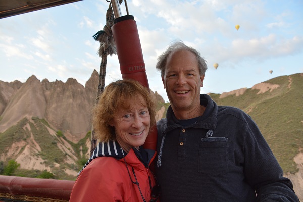 The big highlight of our trip was hot air ballooning over Cappadocia at sunrise. Generally there are 20+ people in a balloon basket, but ours had just 5 of us and a wonderful pilot with perfect English and a passion for sharing his knowledge of the balloon and how it works. We peppered him with questions as we drifted gently over the fairy chimneys. At one point he skillfully brought the balloon down between several fairy chimneys maneuvered back out again.