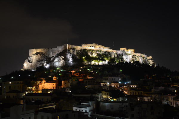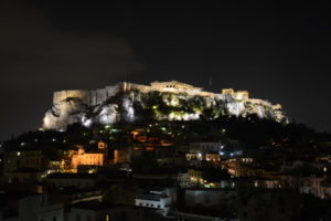 The rooms were small, and the elevator to the roof deck was exasperatingly slow and, only holding two people, incentivized everyone to get exercise doing the Stairmaster instead. But, the location and the views made up for it. As we arrived it was just getting dark. Hurrying up to the roof deck we were rewarded by the view–the Acropolis all lit up high above the city. The bar on the roof deck provided another reward!