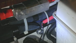 Maneuvering with the only wrench I had handy, a box wrench, in a tight space meant I needed to work the wrench at bad angle which was rounding off the edges on the nut and not budging it. Further complicated by the fact the wrench was too long to swing it more than a few degrees. On top of that, the wrench was not insulated and I was working next to a large thru-hull valve which, of course, is grounded. One slip or misalignment would result in an electrical arc with the full amperage of the battery. One big spark! It would probably instantaneously weld the wrench to the thru-hull, and momentarily blind the person on the other end of the wrench—me! My quick solution was to pull the next fuse down the line (isolating two of the three batteries) then go after the correct fuse with a pair of Vicegrips. Not pretty or safe, but it got the job done.