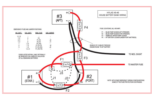 Time is wasting, I don’t know whether I have seconds or minutes before the battery bursts into flames. In a panic my thinking is not clearly logical. This is why they say we should have standard procedures and drills. Reactions must be instantaneous. I need a second to think, calm down, I tell myself. Find the schematic. Coincidentally, I just had the DC schematic reprinted while I was back in the states. Forget the old copy, a new one is in my backpack. Quick, flip it open. Oh yes, one electric solenoid and one breaker and I can transfer the load and shut down the bank without an interruption. It works!