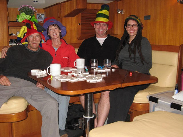 They put an extra anchor out to kedge off. Bob K also rode around the boat in the dinghy to create waves, hoping they would lift the boat free. No luck. We needed to wait for high tide. In the meantime we had a couple on shore, sitting on a bench drinking their morning coffee, totally entertained by our activity. It rained all day. At 5 pm we again worked to kedge off. This time it worked. We moved the boat to deeper water and spent the night. While we did our evening kedging activity the same couple reappeared, this time with cocktails.