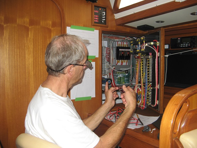 We never got off the boat all day. Sara spent the day writing and reorganizing the boat. Bob and the crew worked on boat projects – mast leaks, Raymarine issues, etc. Plus, Bob made the final connections of the new electrical equipment to the distribution panel to enable the boat to operate on European 50 hertz/230 volt power.